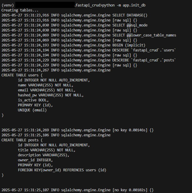- 프로젝트에 정의한 모델을 기반으로 실제 데이터베이스에 테이블을 생성하려면 SQLAlchemy의 create_all() 메서드를 사용