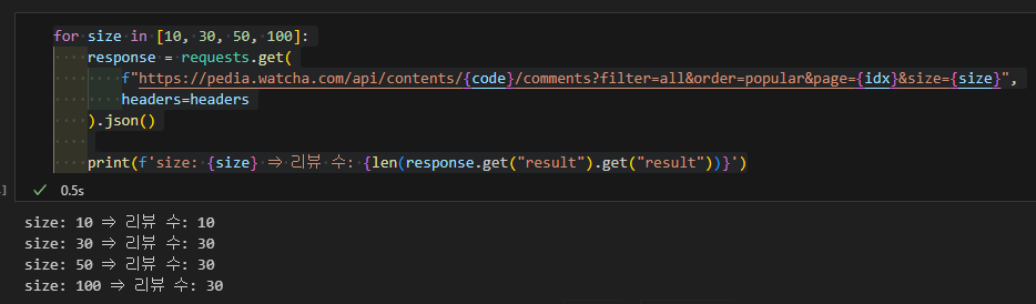 print(f'size: {size} ⇒ 리뷰 수: {len(response.get("result").get("result"))}')