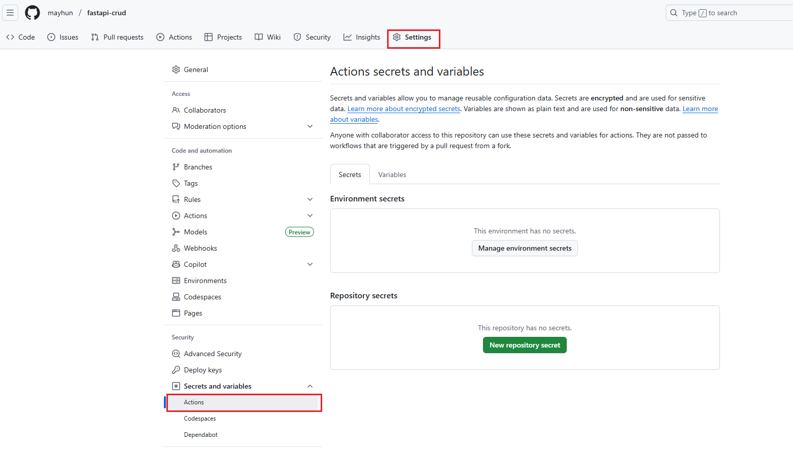 2. Actions secrets 설정