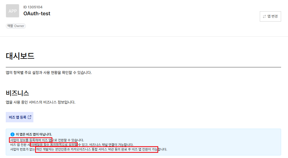 - 비즈앱 전환시 이메일을 필수 동의항목으로 설정할수 있으며, 사업자 번호가 없는 개인 개발자는 본인인증과 카카오 비즈니스 통합 약관 동의 후 비즈앱 전환이 가능하다.