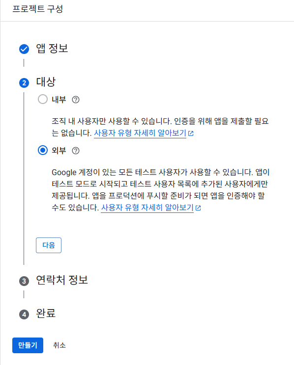 4. Google 계정이 있는 모든 사용자가 사용 가능하도록 외부로 설정한다.