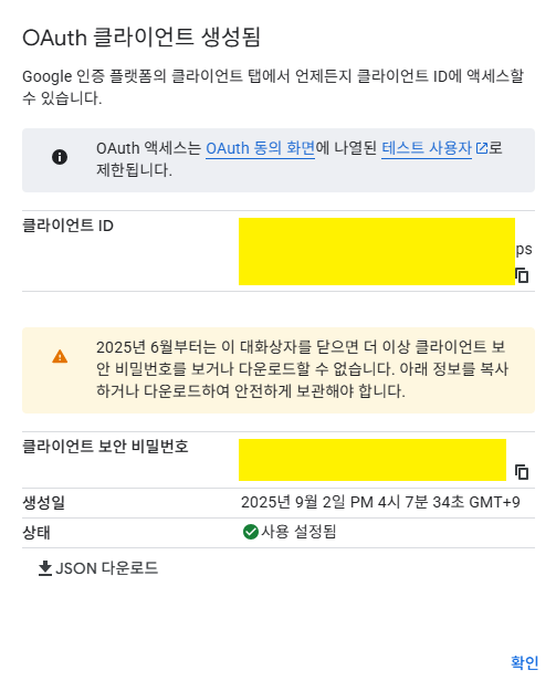 6. 만들기로 생성을 하면 OAuth 클라이언트가 생성된다.