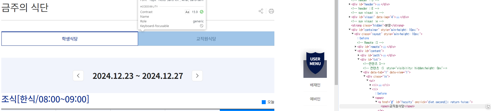 driver.execute_script("diet.second();") # 교식원 식당 페이지 이동