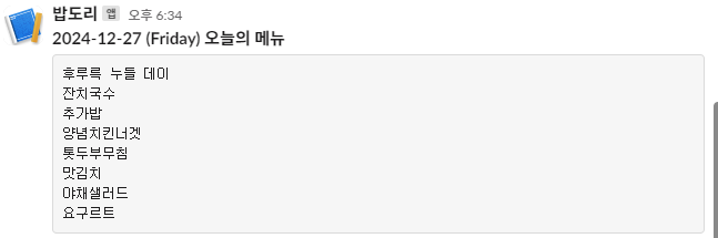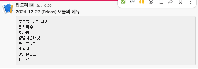 message = f"*{date_string} 오늘의 메뉴*\n```{today_menu}```"