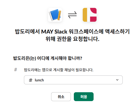그리고 Incoming Webhooks로 넘어와 Add New Webhook to Workspace를 클릭하면 아래와 같은 화면이 나오고, bot을 추가할 채널을 선택 후 허용을 해준다.