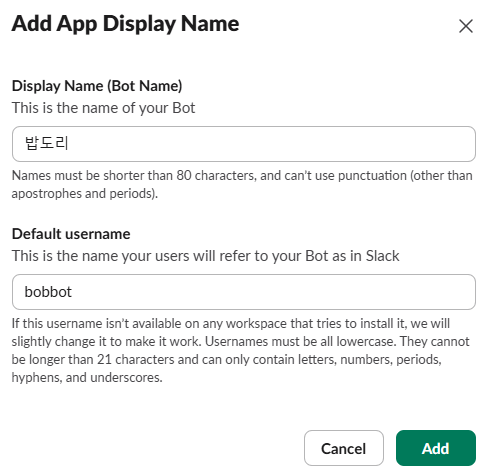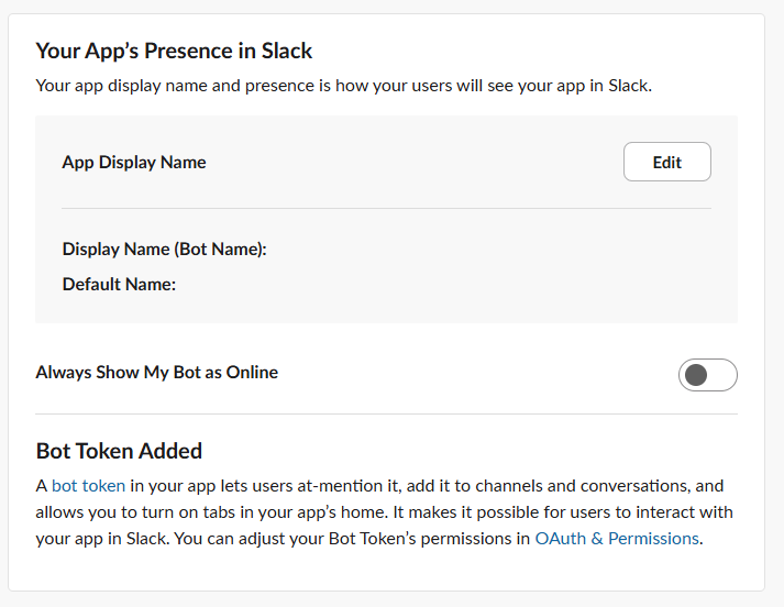 이전에 설정할땐 없던 방법인데, 위 incoming webhooks의 글을 다시 읽어보니 bot user가 필요하다고 한다. bot user의 링크를 클릭하면 app home 으로 넘어간다.
