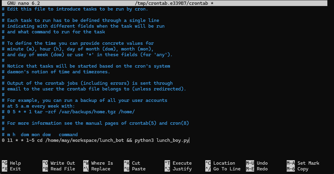 crontab을 사용하여 평일 11시 정각에 py 파일을 실행 하도록 설정 하면 된다.