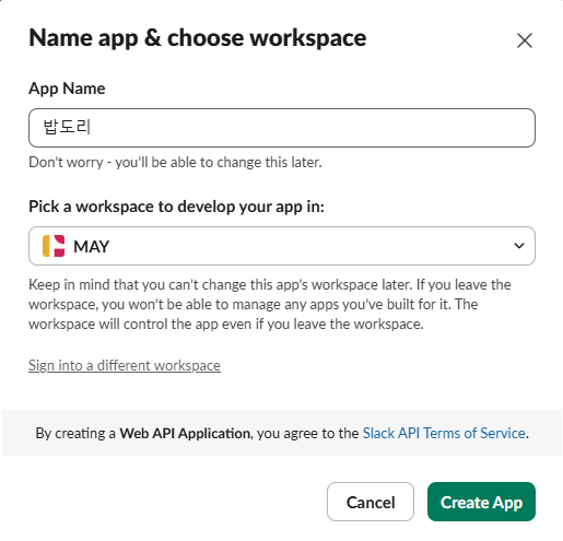 4. App Name와 추가할 workspace를 선택 후 create app을 클릭하면 app이 완성 된다.