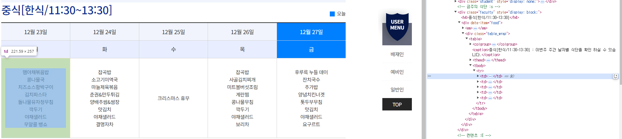 today_menu = driver.find_element(By.XPATH, f'//*[@id="txt"]/div[8]/div/div/table/tbody/tr/td[{weekday_index}]/div').text